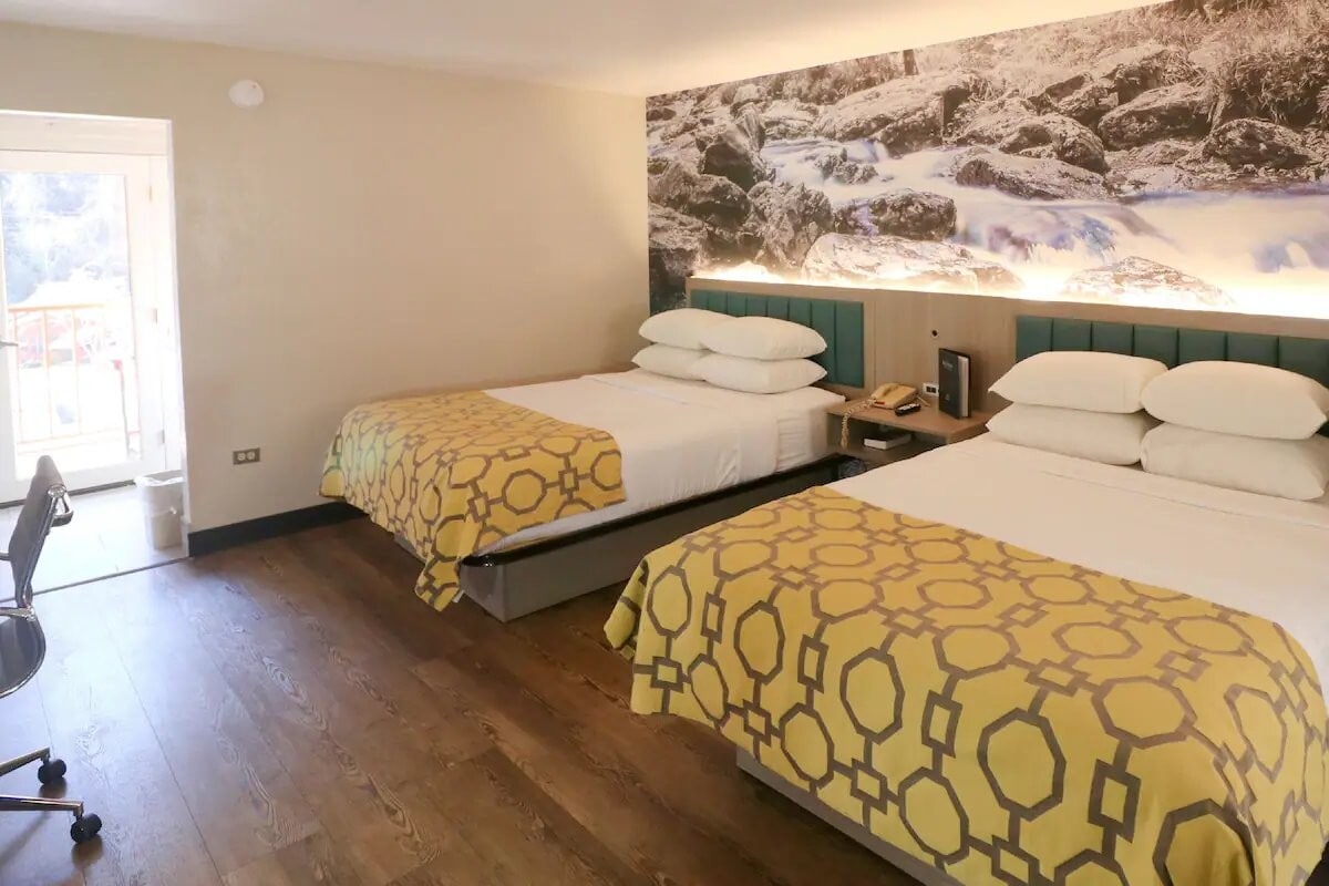 Camera deluxe con 2 letti a 2 piazze e caminetto del River Edge Inn
