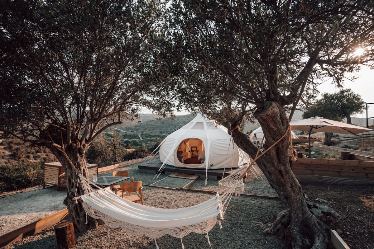 Aura Tent offre un soggiorno tranquillo vicino alla natura con tutti i comfort. La tenda può ospitare fino a 4 persone con un letto matrimoniale e un divano letto matrimoniale, elettricità e aria condizionata/riscaldamento. A pochi passi di distanza si trova il bagno privato esterno con doccia calda. Avrai anche a disposizione la tua parte della collina con un pergolato, una cucina all'aperto, un barbecue a gas e fornelli, una zona pranzo, oltre a set per la preparazione di tè e caffè, con vista sulle verdi colline. Gli ospiti di Aura Tent hanno accesso esclusivo a una vasca idromassaggio privata.
