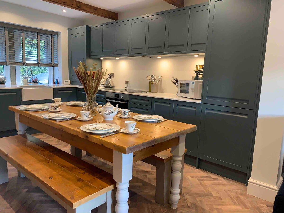 Splendido fienile ristrutturato (6 posti letto) e accogliente baita (2 persone extra) in una tranquilla frazione recintata di proprietà nella campagna del Saddleworth con vista mozzafiato ✶ Goditi la tua vasca idromassaggio a legna, il braciere, il bosco privato e il lago ✶ Amichevoli animali da fattoria, capre pigmee e spazio per i bambini per giocare♡ Stufe a legna, giochi da tavolo, cucina moderna, baita elegante. Perfetto per famiglie e amici. Ottimo accesso a passeggiate, villaggi, pub, M62, Manchester e Leeds. Un rifugio unico in campagna per ricordi indimenticabili