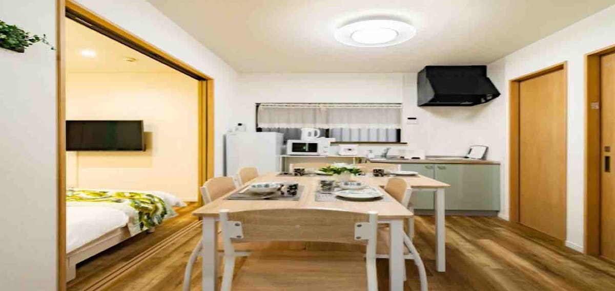Questo alloggio è ideale per godersi un soggiorno a medio-lungo termine con la famiglia e gli amici. Si tratta di un aparthotel aperto nel 2023, situato in una tranquilla zona residenziale vicino al centro della città. Nelle vicinanze si trovano un fiume, un parco e un santuario. Gli interni spaziosi di 35 m² sono progettati in stile giapponese. Dispone di 1 letto matrimoniale e 3 futon, per un totale di 5 adulti. (I bambini sotto i 2 anni che dormono con i genitori soggiornano gratuitamente.) C'è una cucina compatta che puoi cucinare, una lavatrice e asciugatrice completamente automatiche, un bagno spazioso e servizi igienici separati. L'ambiente è dotato anche di Android TV e Wi-Fi gratuito, quindi è un ambiente adeguato per trascorrere del tempo al chiuso o lavorare. Gli ospiti possono anche rilassarsi sul rooftop. Il check-in avviene tramite un sistema di check-in automatico che utilizza un tablet, quindi non dovete preoccuparvi nemmeno a tarda notte. La porta è gestita con il più recente sistema di chiavi a sfioramento. Si trova a 5 minuti a piedi dall'uscita della stazione più vicina (stazione Sumiyoshi, linea Hankyu, linea Toei Shinjuku) e nelle vicinanze ci sono supermercati e altri negozi. Rilassatevi con la vostra famiglia in questo alloggio tranquillo.