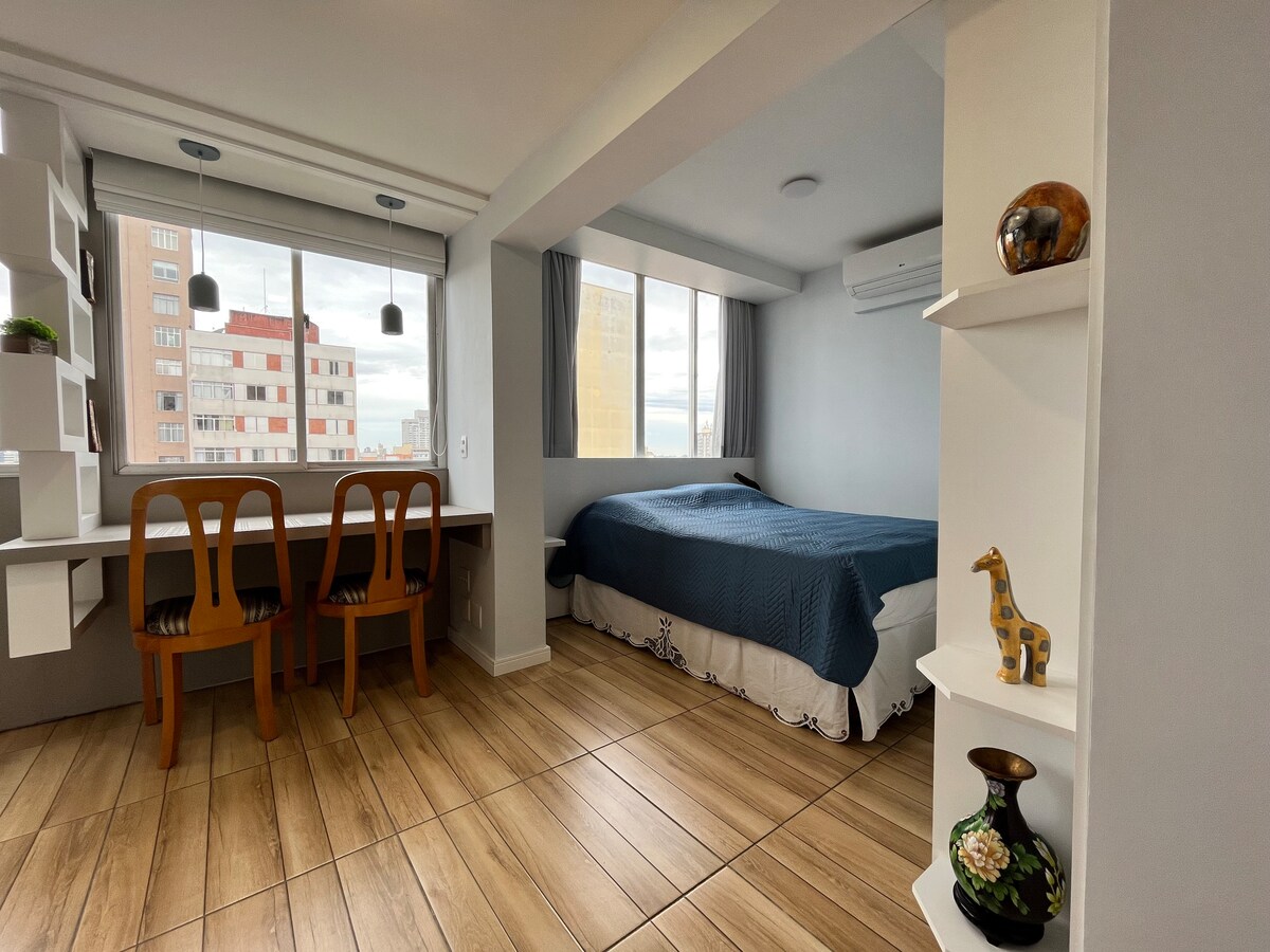 Bellissimo appartamento situato nel cuore della città. Vicino al quartiere bohémien di Batel, questa posizione vanta molti negozi e centri commerciali, come Shopping Crystal e Shopping Pátio Batel, Rua 24 horas. Ideale per due persone, dispone di una zona soggiorno/pranzo, una camera da letto, un bagno completo e una cucina completamente attrezzata. Lo spazio dispone inoltre di: wifi, smart TV, aria condizionata calda e fredda, acqua calda e fredda in cucina e in bagno. Forniamo biancheria da letto e asciugamani.