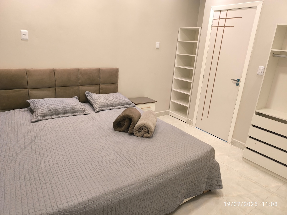 Spazio molto ben posizionato, vicino a INPA, UFAM, supermercati, centri commerciali, ristoranti e viali. La camera è confortevole e dotata di letto, TV, aria condizionata e armadio. La cucina è completa, con frigorifero, forno a microonde, piano cottura e friggitrice ad aria, oltre a una zona pranzo. La struttura dispone di altri appartamenti individuali, garantendo privacy, praticità e benessere durante tutto il soggiorno.