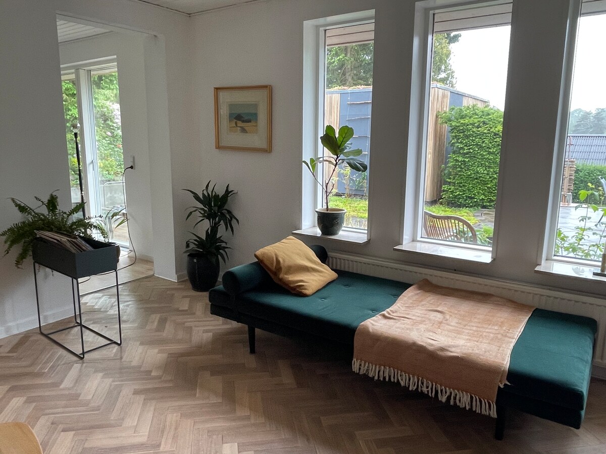 Appartamento luminoso recentemente ristrutturato al piano terra in una casa indipendente a Lysbro, a 3 km dal centro di Silkeborg. C'è accesso al giardino, terrazze e padiglione, vista sul bosco di Lysbro e dal nostro giardino c'è accesso diretto a Lyså. Ci sono soggiorno, cucina completamente attrezzata, camera da letto con letto matrimoniale e bagno. La nostra casa si trova vicino al lago e alla foresta e ci sono buone opportunità per escursioni a piedi e in bicicletta. È inoltre possibile utilizzare le piste per mountain bike nelle foreste, nonché il kayak e il paddleboard dal pontile nel nostro giardino.