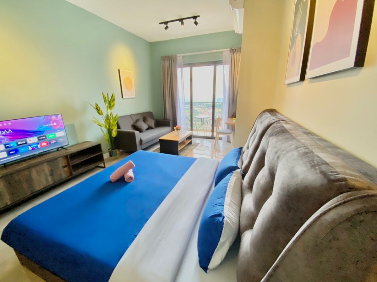 Experience a cozy stay in our modern studio at Silverscape Residence, Melaka, perfect for two! Enjoy cityscape vistas view from the high-rise balcony. The studio is fully furnished with a comfy queen-sized bed, kitchenette, Wi-Fi, and TV Box with unlimited movies. Located near vibrant attractions, shopping, and dining spots, it's the perfect base for exploring Melaka. Guests also have access to a infinity pool and 24-hour security. Ideal for couples or solo travelers!