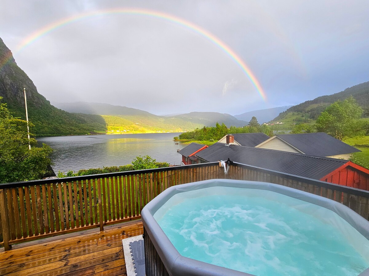 Nyt eit rolig gårdsopphold på ei sjelden perle kun 15-20 minuttar frå Voss sentrum. Et rolig sted å være for både for par eller større familier. Smak på våre selvproduserte produkter fra bigården, eller av de mange grønnsaker, kjøtt, frukt og bær som produseres. Nyt stillheten på vannet i robåt eller SUP brett, eller helt alene på din private strand. Opplevelsen i jacuzzi på kveldstid er helt magisk. Våkne opp til soloppgang over innsjøen med utsikt direkte fra senga, eller foran peisen.