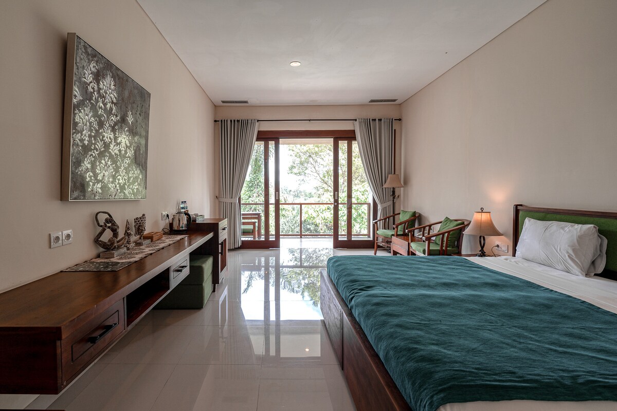 Unwind in our comfortable Superior Room, featuring a cozy bedroom, private bathroom, and a balcony with breathtaking mountain views. The room also includes a workspace, ideal for remote work or relaxation. Guests can enjoy the shared pool and a complimentary breakfast each morning. Located within a serene resort, you’ll have access to organic dining, yoga and meditation pavilions, a spa, and cultural experiences such as temple tours and farming lessons, all designed to enhance your stay