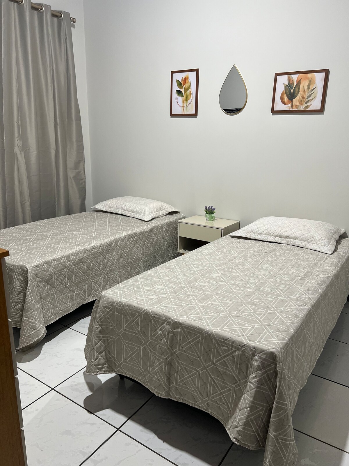 Apto com 2 quartos com ar condicionado, cada quarto temos 1 cama de casal , e 1 de solteiro, lençóis,cobertas e travesseiros, sala com sofá cama, cozinha completa c/ utensílios, banheiro com BOX, lavanderia, garagem para carro pequeno, porém tem uma entrada comprida que acomoda uma caminhonete, Bairro tranquilo, próximo a Bares, restaurante, supermercado, farmácia, 5 minutos do aeroporto, faculdade Fasip etc, Próximo ao centro OBS:🚫 É proibido fumar no ambiente. Ao sair Recolha o lixo!