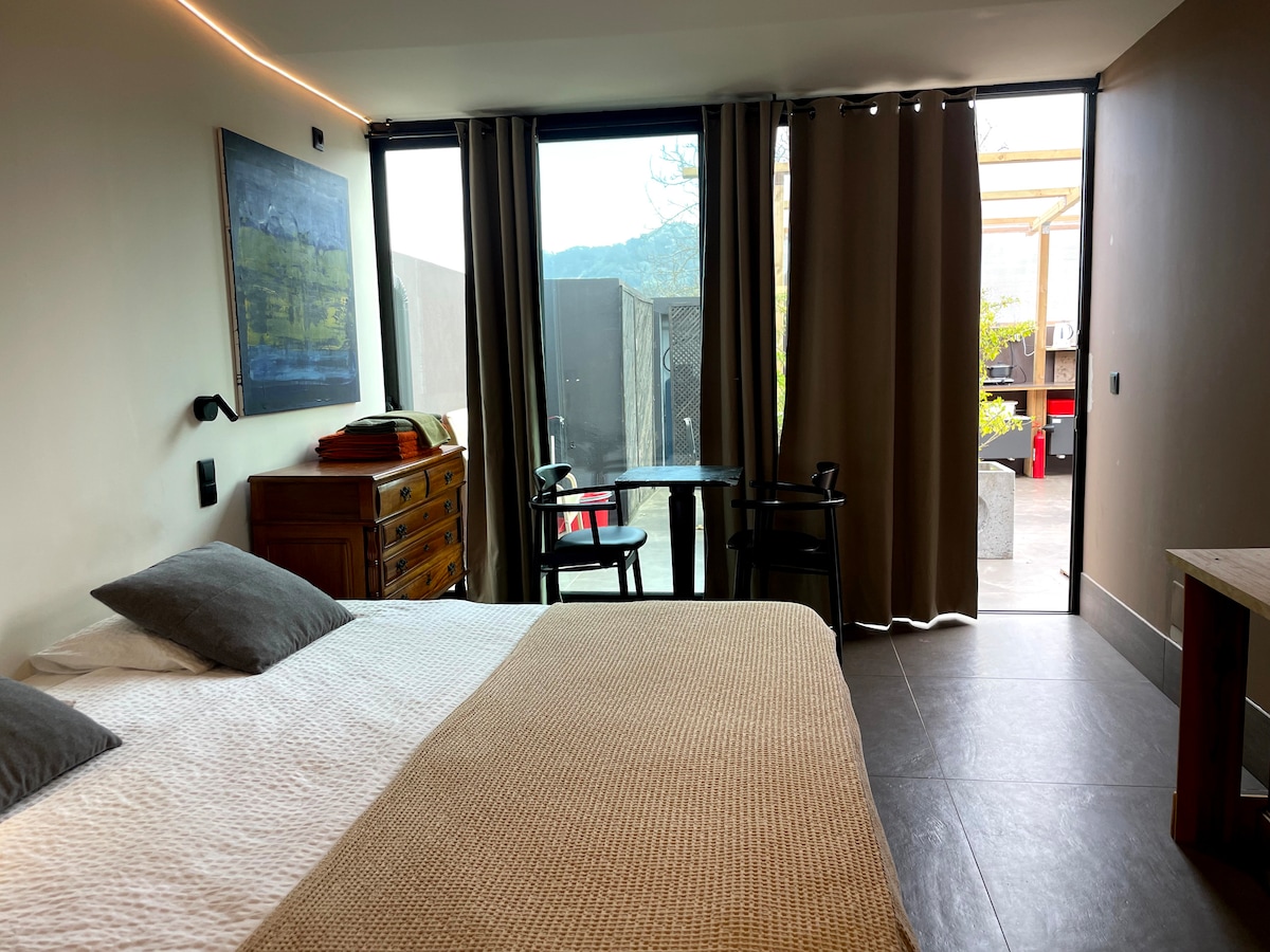 Dream On por NOOK - Studio 2 Un rifugio contemporaneo immerso nella natura, con vista mozzafiato sui palazzi di Sintra. Questo monolocale luminoso e accogliente è ideale per chi viaggia in solitaria o per le coppie in cerca di pace e comfort. Dispone di un letto accogliente, un bagno privato e accesso diretto al giardino condiviso e alla piscina a sfioro. A soli 50 metri da un centro di meditazione e da un tempio buddista, questo spazio offre l'ambiente perfetto per riposare, concentrarsi e riconnettersi con la natura.