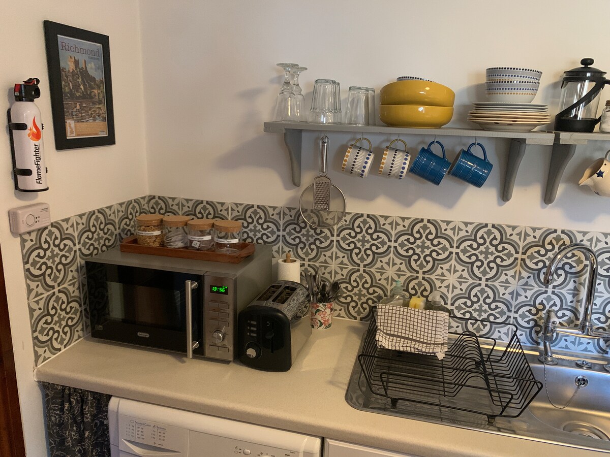 Accogliente cottage con una camera da letto e stufa a legna, situato proprio in fondo alla collina rispetto al Richmond Market Place. Una camera da letto al piano superiore. Cucina, sala da pranzo e salotto sono tutti nella stessa area, con un divano letto al piano terra. Riscaldamento a pavimento al piano inferiore. Biancheria da letto e asciugamani sono forniti agli ospiti. Molte passeggiate partono direttamente dal cottage, con il fiume dietro l'angolo. La passeggiata al castello dista 2 minuti. Pub e ristoranti raggiungibili a piedi. Richmond ha tutto il necessario per una pausa favolosa.
