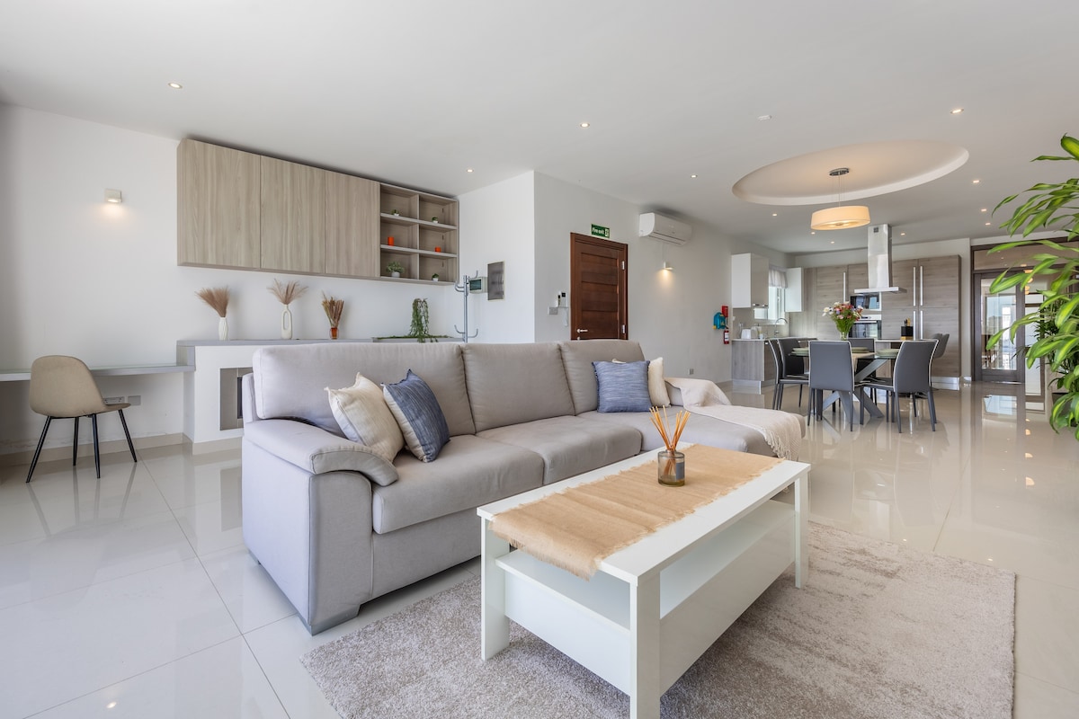 (Licenza MTA - HPI/7644). Perfetta per una famiglia numerosa o un gruppo grande. Alloggio di lusso con 3 bagni, cucina moderna, ampio soggiorno a pianta aperta e terrazza privata. Su richiesta, è disponibile un parcheggio a pagamento sotto la struttura. L'affitto include tutti gli extra, compresi asciugamani e biancheria da letto. L'alloggio può ospitare fino a 10 persone con preavviso. Situato in posizione centrale, è perfetto per scoprire Sliema, St. Julian's, Paceville e La Valletta (in traghetto).