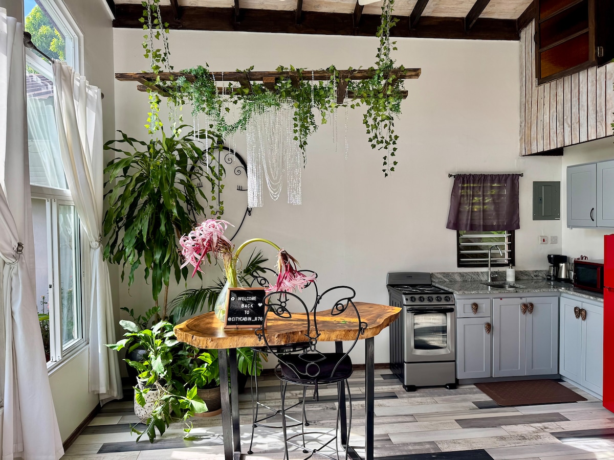 Ti invitiamo a goderti il nostro rifugio urbano sicuro, nascosto in bella vista: una baita di legno, situata accanto a City Cabin, nella vivace zona di Liguanea. Riconnettiti con la natura, goditi la splendida vista sulle montagne, passeggia nel nostro giardino verdeggiante e ascolta gli uccelli di giorno e le creature notturne. La base perfetta per esplorare il Museo Bob Marley, la Devon House, ristoranti, caffetterie, negozi e supermercati, alcuni raggiungibili a piedi, altri a breve distanza in auto. Siamo lieti di ospitarti!