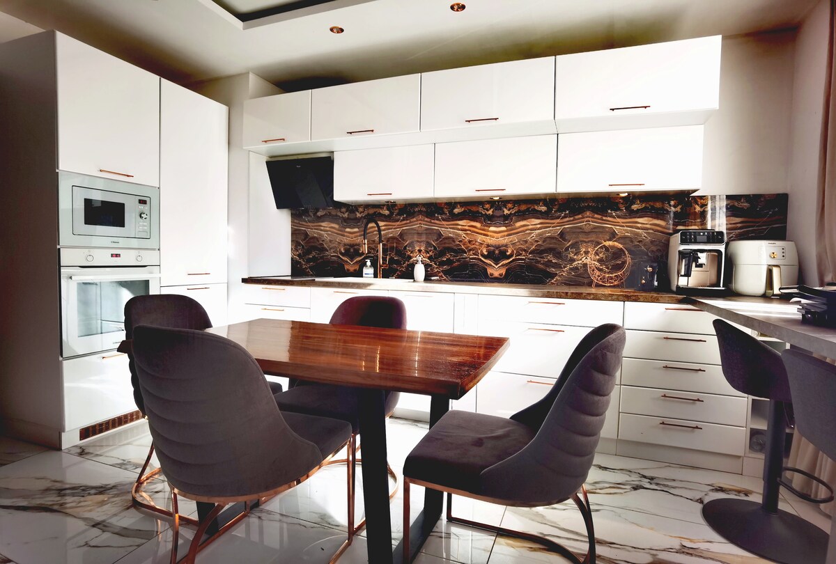 appartamento di lusso completamente modernizzato al piano terra di un edificio classico in una posizione centrale di fronte a South Park, al centro commerciale Park Centre e alla stazione della metropolitana europea. La struttura dispone di lussuosa cucina/zona pranzo e soggiorno, bagni in marmo con ampia doccia di lusso e vasca separata, camera da letto principale con letto matrimoniale grande e mobili italiani dappertutto. Ha l'atmosfera e la qualità di un hotel a 5 stelle con tutti i vantaggi e l'indipendenza di un appartamento a grandezza naturale.