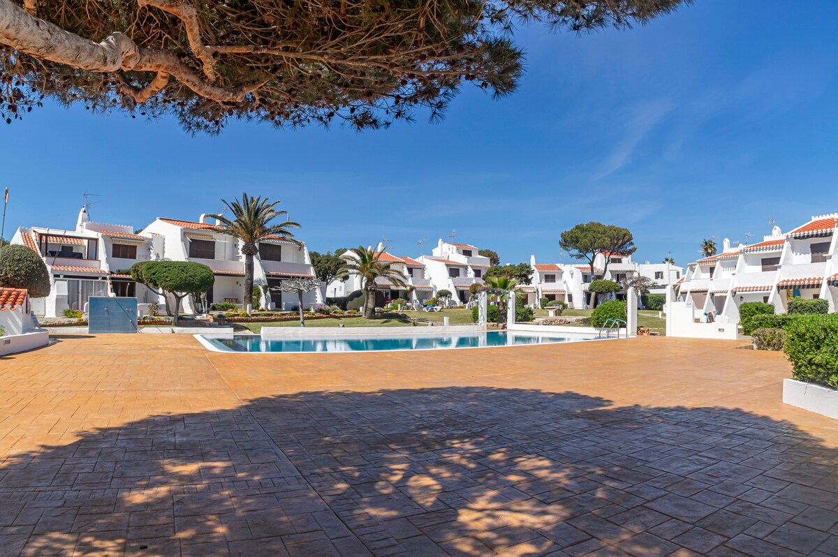 La nostra tipica "casita menorquina" si trova a 100m da Cala Blanca, una graziosa piccola spiaggia cristallina con ristoranti e bar. Si trova in un quartiere molto tranquillo, all'interno di un piccolo appartamento con altre 3 case simili che condividono una grande piscina. La casa ha un grande spazio esterno privato con giardino e barbecue e... la migliore... una terrazza panoramica con zona relax e una splendida vista mare/tramonto. In casa dispone di 2 camere con aria condizionata.