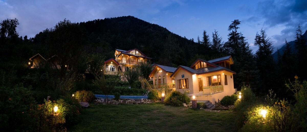 Festeggia la natura con il sole nel cottage himalayano di Tirthan Valley ! Questo cottage a 6 camere da letto a cinque stelle offre camere individuali con bagni annessi e balconi lungo il fiume! Accesso illimitato alle piscine naturali del fiume incontaminato Tirthan, pesca alla trota, tanto spazio per trovare il tuo angolo tranquillo per leggere il tuo libro, alcuni piatti himachali, indiani e occidentali da far venire l'acquolina in bocca, un camino per le notti fredde: tutto questo rende il Sunshine Himalayan Cottage un'esperienza da non perdere!