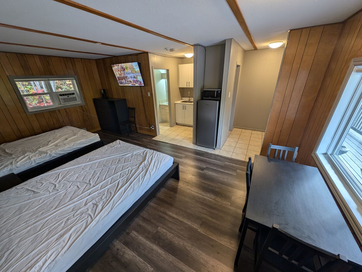 La camera Six dispone di 2 letti matrimoniali con un piccolo bagno in 3 pezzi dotato di wc, lavandino e doccia. Tutte le nostre camere sono dotate di forno a microonde, macchina del caffè e frigo bar, aria condizionata, riscaldamento elettrico, TV con servizio satellitare, Wi-Fi gratuito, parcheggio gratuito e uso gratuito della nostra area picnic con braciere che si trova sulle rive del fiume Madawaska mozzafiato. Questa camera non si affaccia sull'acqua, ma il lungomare è a pochi passi dalla proprietà.