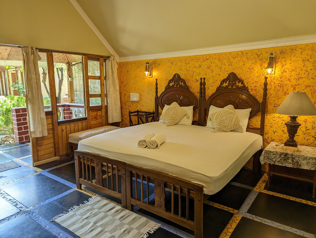 Nirja è una villa con tetto spiovente progettata con cura, dotata di un letto matrimoniale grande, un letto a due piazze nel soppalco a cui si accede tramite una scala in legno ed eleganti bagni privati. Sali sulla tua terrazza privata con vista serena sui lussureggianti terreni agricoli o rilassati nella vasca idromassaggio all'aperto annessa al bagno: uno spazio rilassante e lussuoso per rilassarti e ritrovarsi. Circondata dal canto degli uccelli e dai pavoni, Nirja offre una tranquilla fuga nella calma della natura.