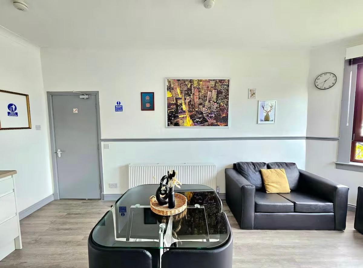 Appartamento con 2 camere da letto recentemente ristrutturato, ideale per famiglie o viaggiatori singoli. Goditi un luminoso soggiorno open space con una cucina moderna completamente attrezzata e un accogliente riscaldamento a pavimento. Entrambe le camere doppie offrono letti comodi per un soggiorno riposante. Possibilità di parcheggio gratuito proprio fuori. A soli 10 minuti di auto dal centro commerciale East Kilbride, dalle stazioni degli autobus e dei treni e a 25 minuti dal centro di Glasgow. L'ospedale Hairmyres dista solo 15 minuti.