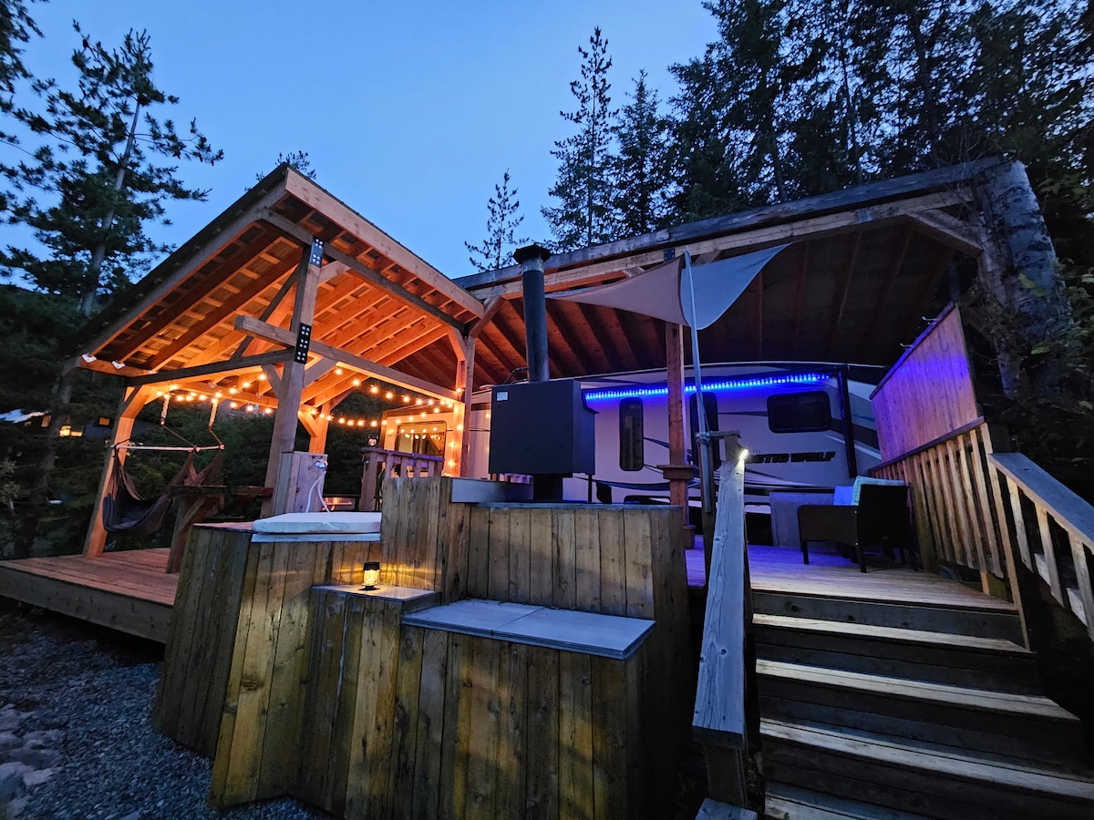 Perfetto per una vacanza! Luminosa, calda e accogliente, nuova roulotte 5th wheel per quattro stagioni immersa nelle montagne. Questo spazio si trova in una posizione privata e dispone di cucina completa, cucina all'aperto con bar, bagno con doccia, fornace a propano, TV da 40 pollici, Netflix, wifi, camino elettrico, posto auto coperto e ampio patio. Troverai anche una vasca idromassaggio riscaldata a legna su misura a pochi passi dalla porta. Il centro di Nelson dista 5 minuti in auto, mentre il Whitewater Ski Resort si trova a 20 minuti.