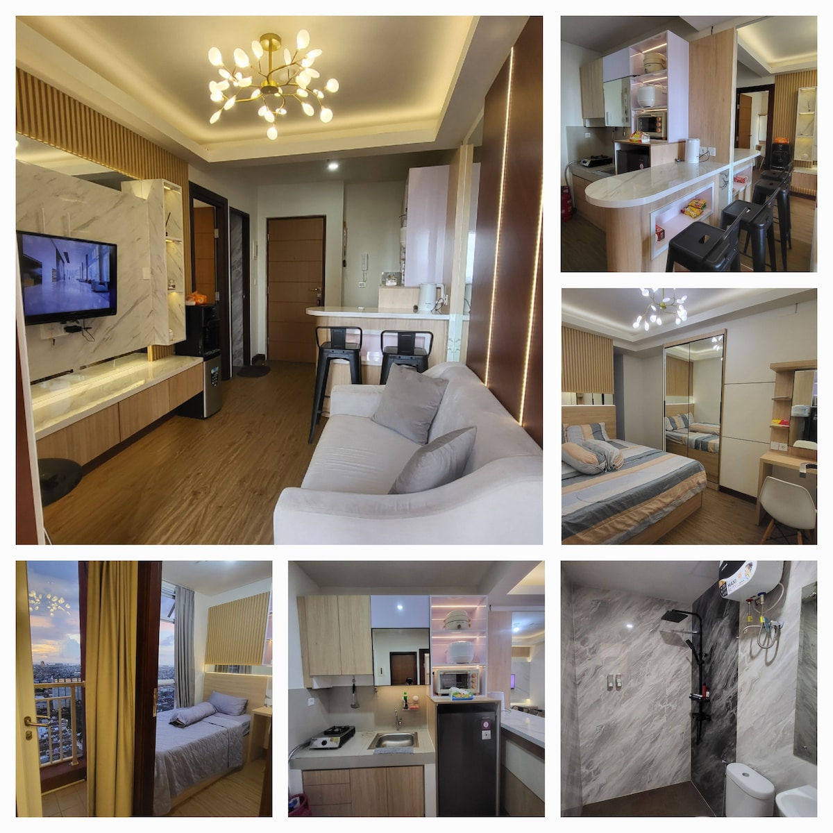 Un appartamento di 34 m² spazioso ed elegante con 1 letto king-size (180 x 200), 1 letto singolo (100 x 200) e un divano letto che può ospitare famiglie o un gruppo di 4 o 5 persone. Situato al 37 ° piano, questo alloggio ha una vista diretta sulla piscina e un'eccellente vista sulla bellissima città di Makassar. L'edificio dispone di sicurezza 24 ore su 24, un'area comune, un centro fitness e diverse piscine. Rilassati e goditi il soggiorno.