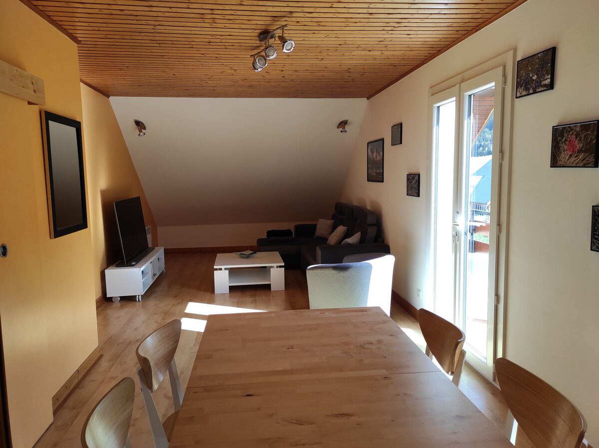 Bel appartement au deuxième étage d'une maison, spacieux, calme, avec balcon sud et vue magnifique sur la chaîne de montagne. Garage fermé et parking privé. A 600 m du centre du village. Nombreuses installations de loisirs dans un rayon de 1 km : centre aquatique, patinoire, cinéma, luge parc. Domaines de ski alpin et nordique à 3 km avec service de navettes gratuites. Large éventail de promenades, randonnées et activités estivales (VTT, équitation, ...) sont à votre disposition.