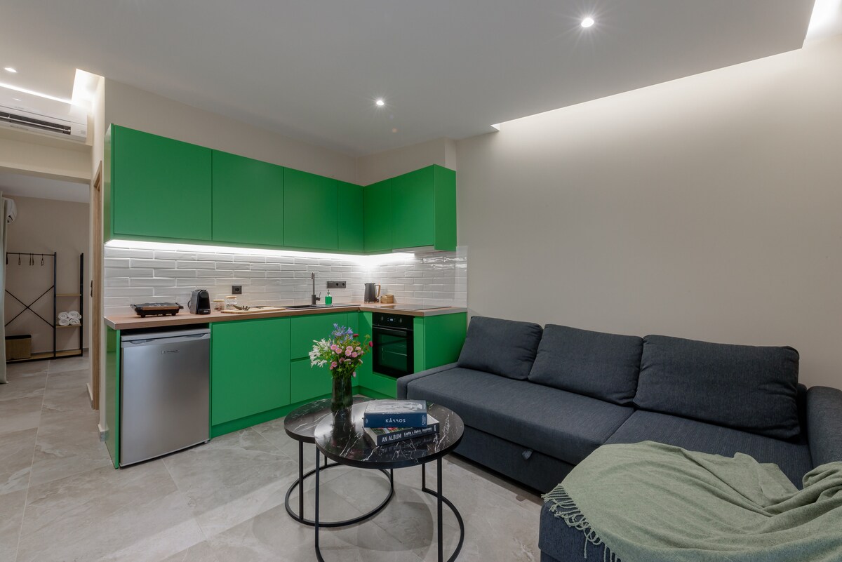 Un appartamento che include 2 camere, un bagno e un grande soggiorno con una cucina e un balcone e un cortile molto confortevoli. C'è anche un parcheggio gratuito. La nostra casa si trova a 10 minuti dall'aeroporto, a 2 minuti dal supermercato e dalla panetteria . A 5 minuti a piedi per Pizza Fun e per il cibo tradizionale greco souvlaki.