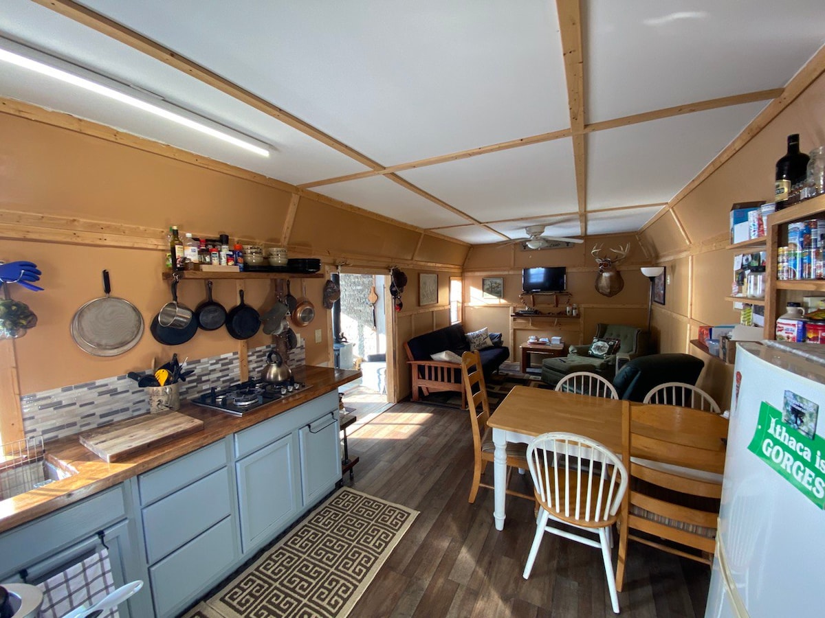 Questo è un piccolo posto speciale in uno spazio molto grande! Ex capanno di caccia che offre la sensazione di essere in un luogo remoto, pur mantenendo i servizi più moderni. Gli ospiti possono esplorare la foresta statale circostante attraverso i numerosi sentieri escursionistici, grigliare un pasto nel patio con anello per il fuoco e sorseggiare un vino locale mentre il sole tramonta. A meno di 20 minuti di auto dalla Cornell University, da Ithaca Commons, dal lago Cayuga e dal Greek Peak, questa struttura offre un facile accesso a una varietà di attrazioni per tutta la famiglia.