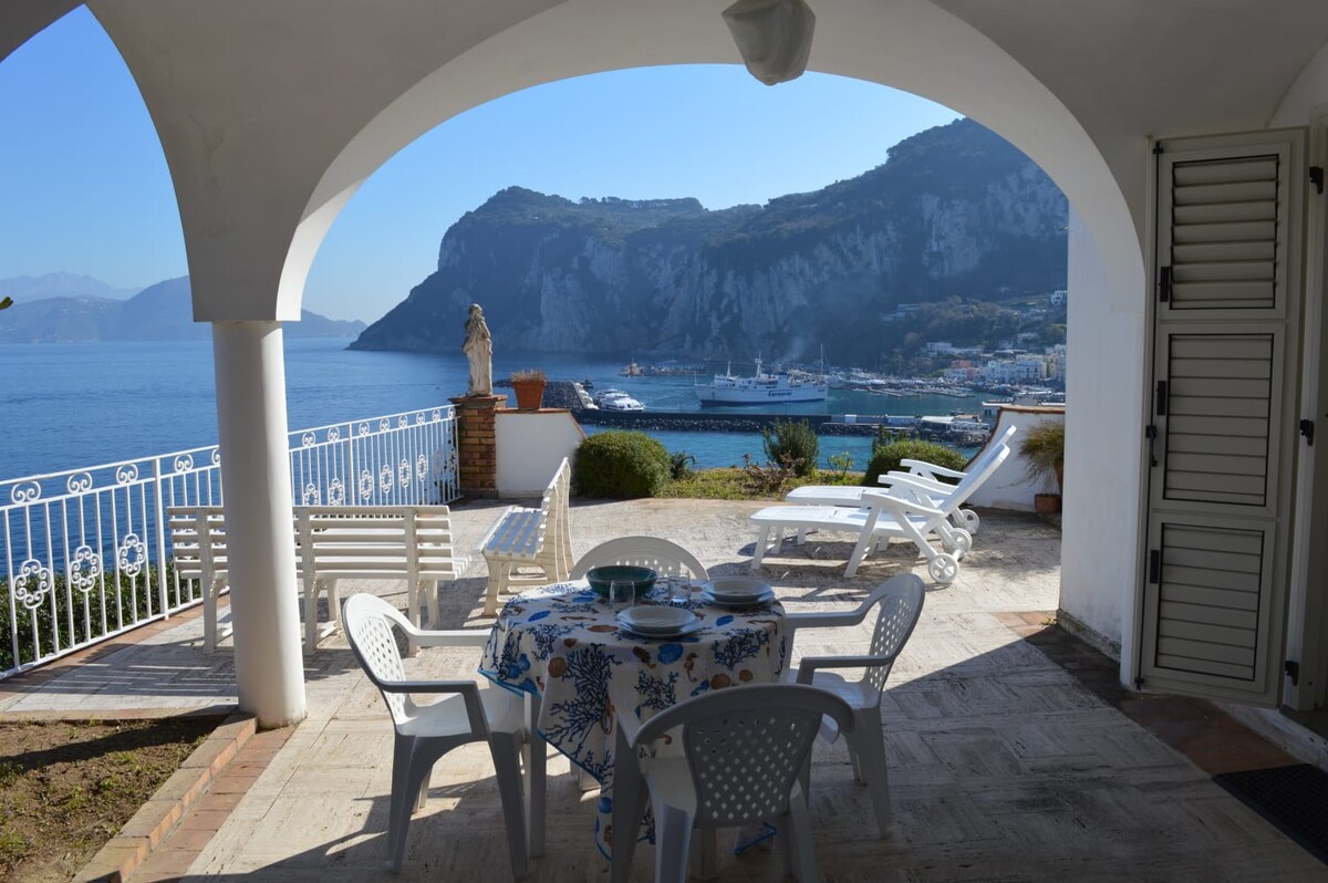 Appartamento in villa con meravigliosa terrazza panoramica a picco sul mare, con vista sul Golfo di Marina Grande, sul Monte Tiberio, sulla penisola Sorrentina e sul Golfo di Napoli dominato dal Vesuvio. Dimora ideale per una romantica vacanza a due. Il porto di Marina Grande con il suo borgo e la funicolare che porta a Capri distano 5 minuti a piedi.