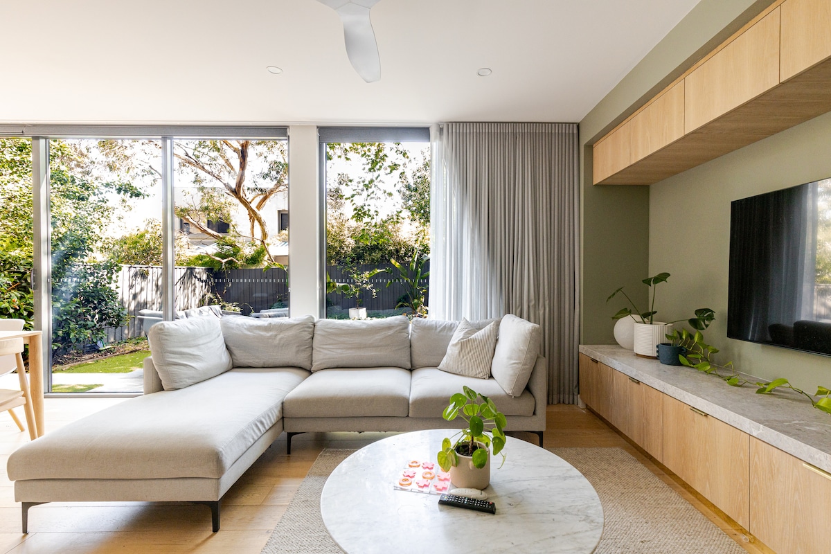 Casa a schiera quasi nuova con TRE condizionatori (riscaldamento/raffreddamento), uno in ogni stanza. IL DIVANO LETTO È STATO SOSTITUITO (ora 1,44 m x 2 m). 2 camere da letto, 2 bagni completi. Letto king size (1,8 m x 2 m) nella camera da letto al piano superiore. Due letti singoli nella camera da letto al piano di sotto. Materassi comodi con molle insacchettate e coperture europee. Smart TV da 65 pollici Wifi veloce con rete NBN. Cucina attrezzata ed elettrodomestici di qualità. Lavatrice e asciugatrice combinate Un balcone per rilassarsi e godersi la brezza.