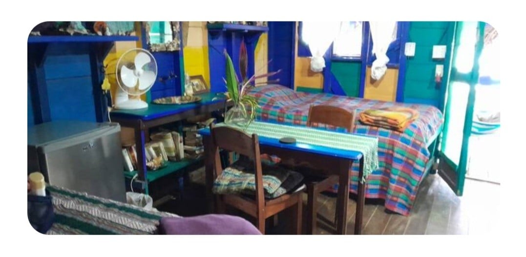 Questo annuncio dice letto singolo, se persona aggiuntiva è 35 USD in più. Questa pensione unica ha uno stile tutto suo. Rilassati in questa vacanza unica sulla spiaggia e tranquilla. Pulito, confortevole piccolo refig, la camera condivisa dispone di 4 letti, tavolo, sedie servizi igienici condivisi. Nessuna cucina condivisa. Ristorante aperto dalle 8:00 alle 21:00 La proprietà fronte mare presenta splendidi dipinti e opere d'arte stravaganti realizzate localmente.