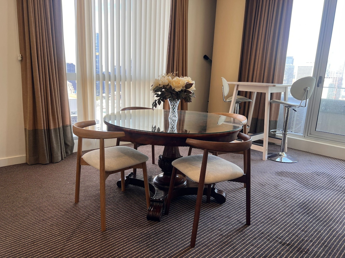 Comodo letto matrimoniale e vista mozzafiato dal 56° piano. Vista sull'oceano durante il giorno e sulle luci della città di notte. Relax in palestra e sauna. Le strutture potrebbero essere chiuse durante la pandemia. All'interno della zona del tram gratuito. Negozi e ristoranti proprio accanto. Vicino al famoso Victoria Market, alla biblioteca statale e alle università. Molto comodo. Sono disponibili altoparlanti e smart TV. Non adatto per scopi di auto-quarantena