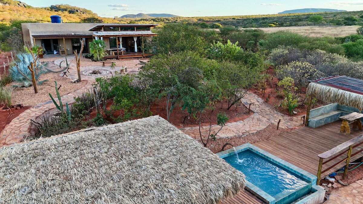 Un cottage con vista mozzafiato sul parco, comfort e privacy. Ha un'architettura ecologica, luce naturale, qualità termica, aria condizionata, fibra ottica e caminetto, offrendo un clima di avventura. Lo spazio è ricco di caatinga nativa e sostenibilità. Goditi la vista a 360°, il barbecue, il ponte versatile e piacevole e le zone relax. Cucina completa e ambiente naturale conservato. Segui l'alba e il tramonto in modo privato e privilegiato e ammira lo spettacolo del cielo del sertão