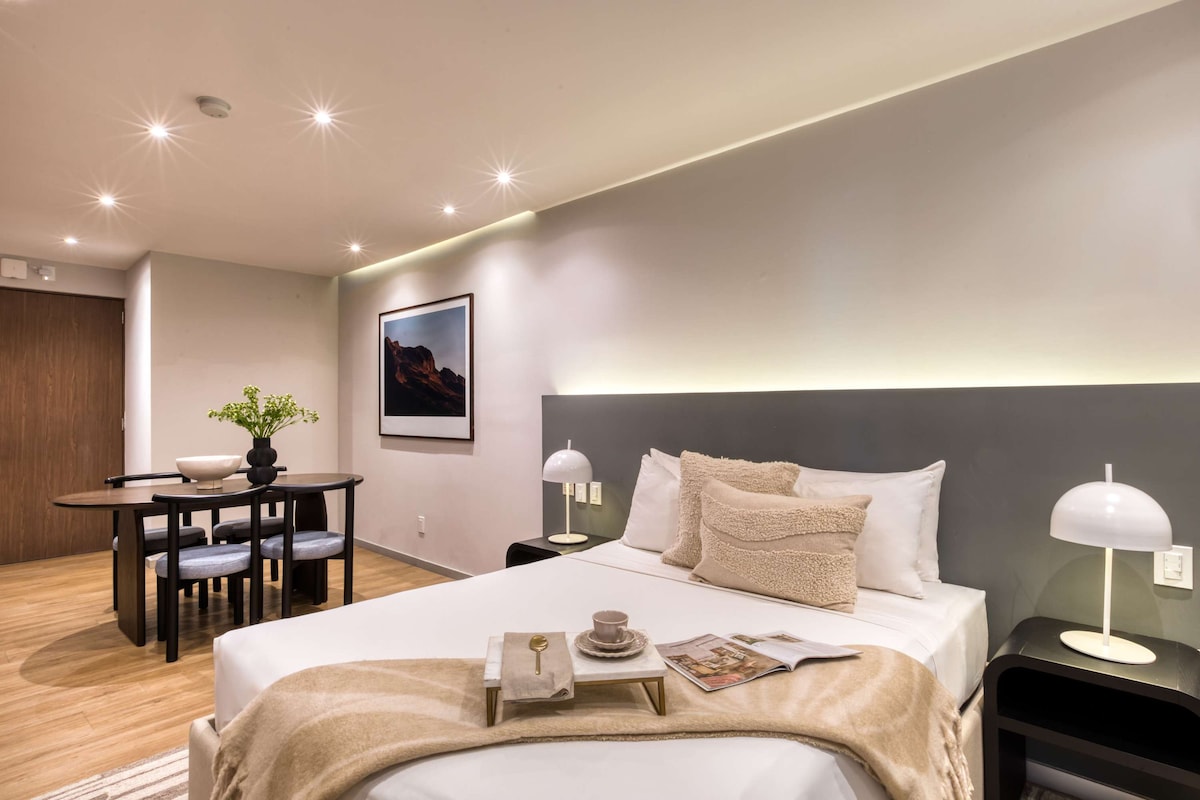 Scopri il comfort, la comodità e la cultura di Città del Messico. I nostri monolocali completamente attrezzati offrono tutto il necessario per un soggiorno produttivo e riposante, tra cui una scrivania dedicata, bagno privato, TV e finestre insonorizzate. Che tu sia in viaggio per lavoro o per piacere, ti sentirai come a casa. Circondata da musei, parchi, ristoranti e attrazioni culturali, la nostra struttura ti mette al centro di tutto.
