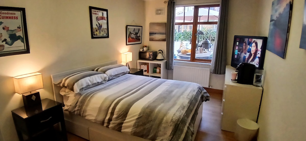 Large, bright, modern spacious double bedroom (5ft bed), beautiful ensuite. Very private. Own entrance. Lock Box. Private Parking. Located in quiet cul de sac. 20 mins from airport. Close to M50 and the Luas, excellent bus service to city centre (bus stop 5 mins from Studio). Contains fridge/freezer, microwave, kettle, Toaster, hairdryer, iron and ironing board. Continental breakfast provided. Sky TV, NETFLIX and Wifi. Close to village with supermarkets, pubs, Restaurants and Takeaways.