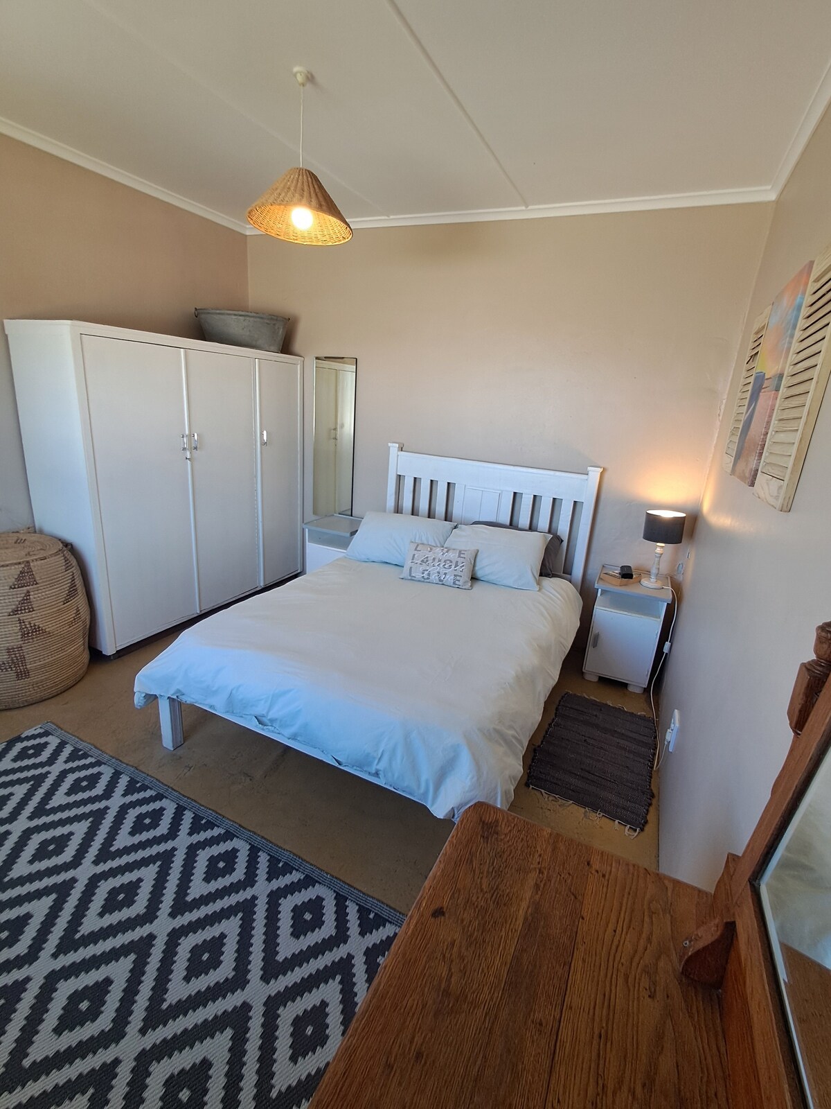 Spacious, private suite with a comfortable king bed, en-suite bathroom, well equipped kitchenette and seating area. Perfect stopover for a relaxed stay in Struisbaai/LAgulhas. WIFI, Lights, Hot water and a Gas cooker available during load-shedding. Secured off street parking. 5km from the most southern tip of Africa, 5 minute walk to the nearest beach and in close proximity to the working boat harbour, restaurants and the longest beach in Southern Hemisphere.