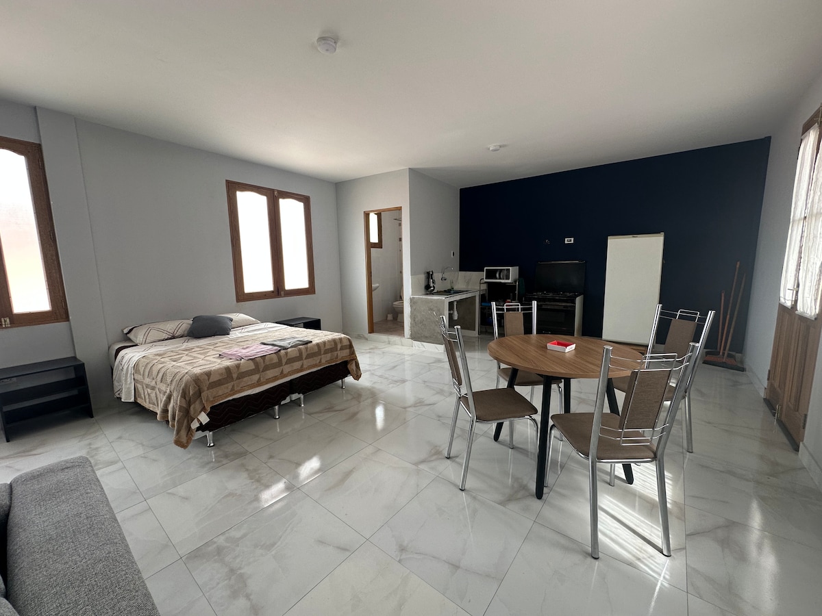 Apartamento privado en segunda planta con acceso independiente por gradas dentro de la propiedad. Espacio de concepto abierto de uso exclusivo para el huésped, una habitación tipo suite, cocina y baño privado y 2 amplias terrazas para relajarte al atardecer. 📍 UBICACIÓN ESTRATÉGICA: 🚌 A 5 min de la Terminal de Buses. 🚶 🚕 A 8 min de la Plaza Principal. (Taxi) 🚏 Transporte público a 2 cuadras. ✅ CERCA A: Restaurantes, Farmacias, bancos y canchas de tenis/pádel. 📌 PLUS: Check-in flexible.