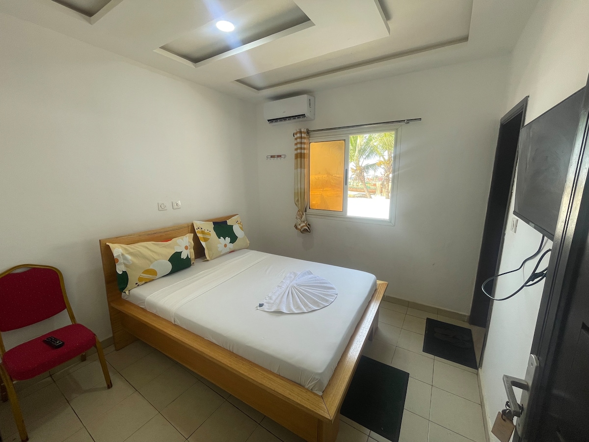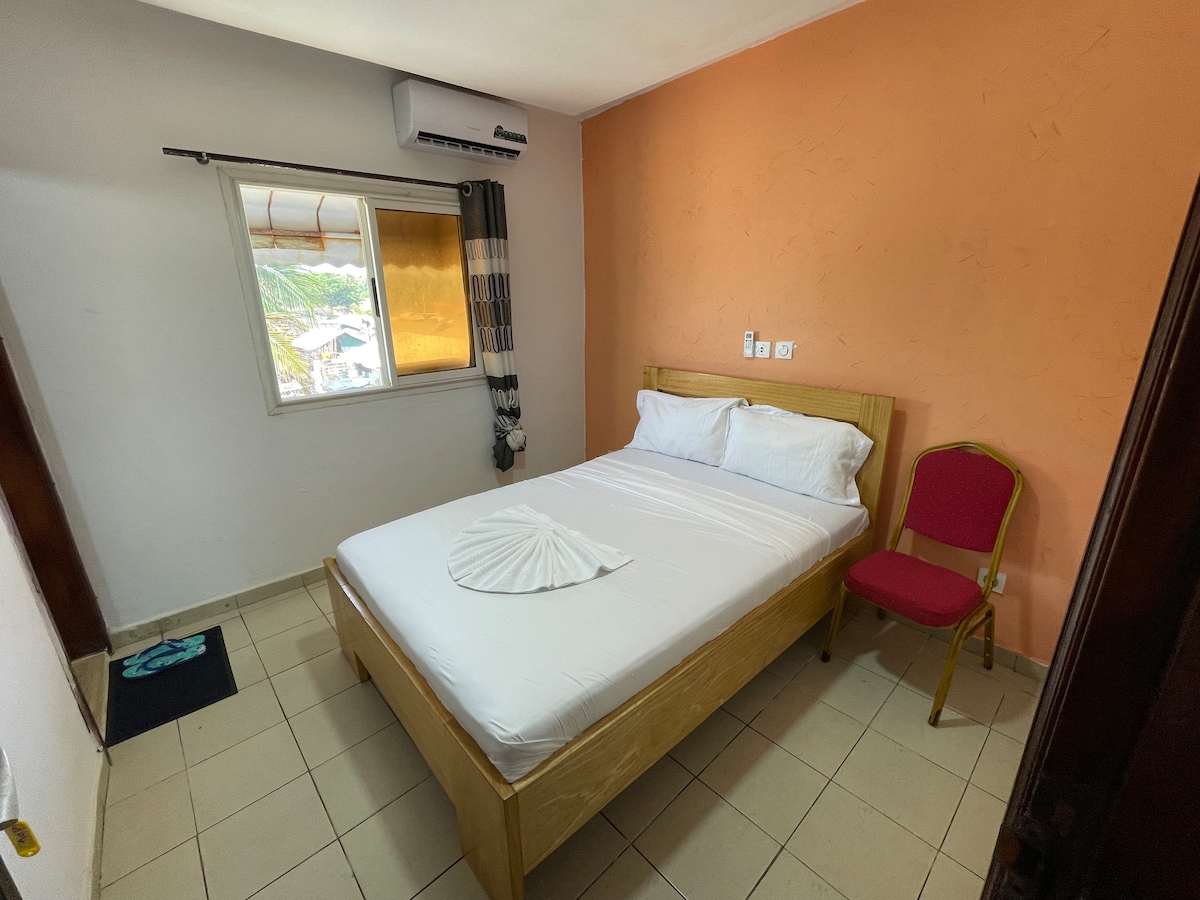 Ad Assouindé, località balneare, a est di Abidjan, 1 camera climatizzata indipendente in una guest house con bagno privato. Una grande terrazza a disposizione in un ampio giardino a 2 minuti a piedi dalla spiaggia e dai ristoranti.