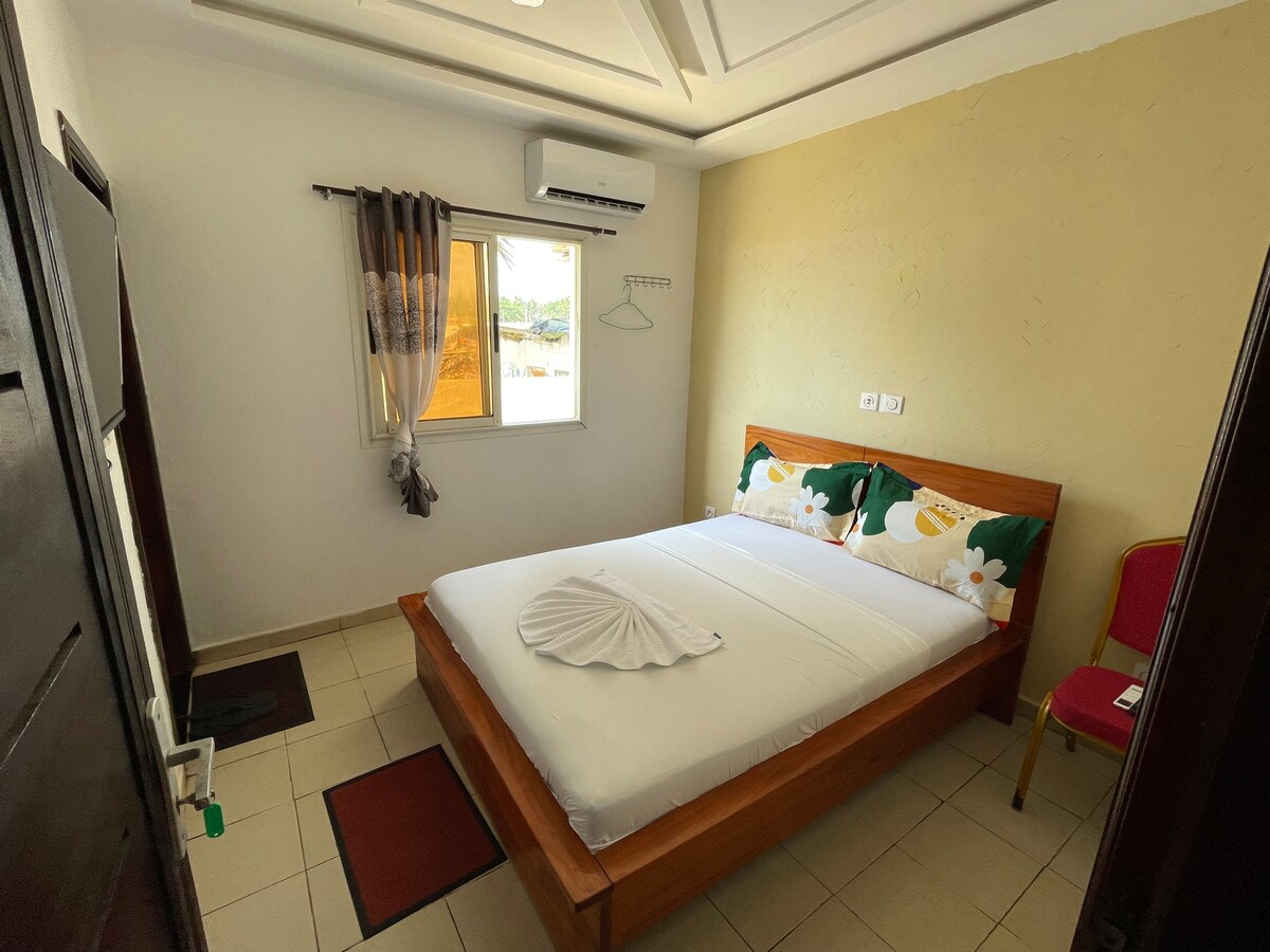 Joli studio situé à Akwaba Résidence, dans le quartier calme de Yaou Nouveau Quartier. Pièce de vie claire avec lit et canapé, cuisine fonctionnelle, salle de bain , climatisation, Wi-Fi et Smart TV. Une terrasse privée équipée permet de manger et se relaxer, complétée par un second espace extérieur donnant sur le patio de la résidence.