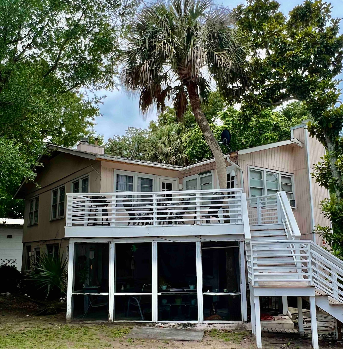 Location, location, location. Literally steps to the sand from this relaxing beach abode! Just roll out of bed and walk through the tree lined tunnel straight to the boardwalk of your own fairly private beach! Bring your dogs and let them roam the huge fenced in backyard lined with live oaks and a fire pit for the family to unite. A quieter part of Folly where the surfers like to shred but still only a short while to the bars of Folly and just 15 minutes from downtown. You will love this place!!