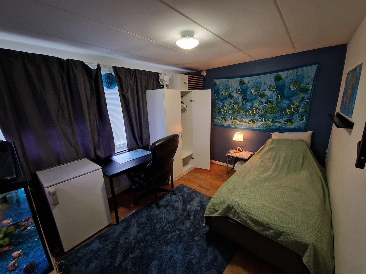 Questa camera offre sistemazioni confortevoli con buoni collegamenti in una tranquilla zona residenziale nel centro di Sundsvall (a 4 km dal centro città). Prestano biciclette senza costi aggiuntivi, ci vogliono 15 minuti per raggiungere la città. Sconto studenti 20%. Grande negozio di alimentari a 2 km da casa. La camera include sempre lenzuola e asciugamani puliti. Frigorifero e chiave di proprietà. Accesso alla cucina condivisa con bollitore, caffè, forno a microonde, piano cottura, forno, lavatrice, armadio asciugatrice. Bagno condiviso con doccia e servizi igienici. Nel garage è presente una presa elettrica per la ricarica lenta delle auto elettriche.