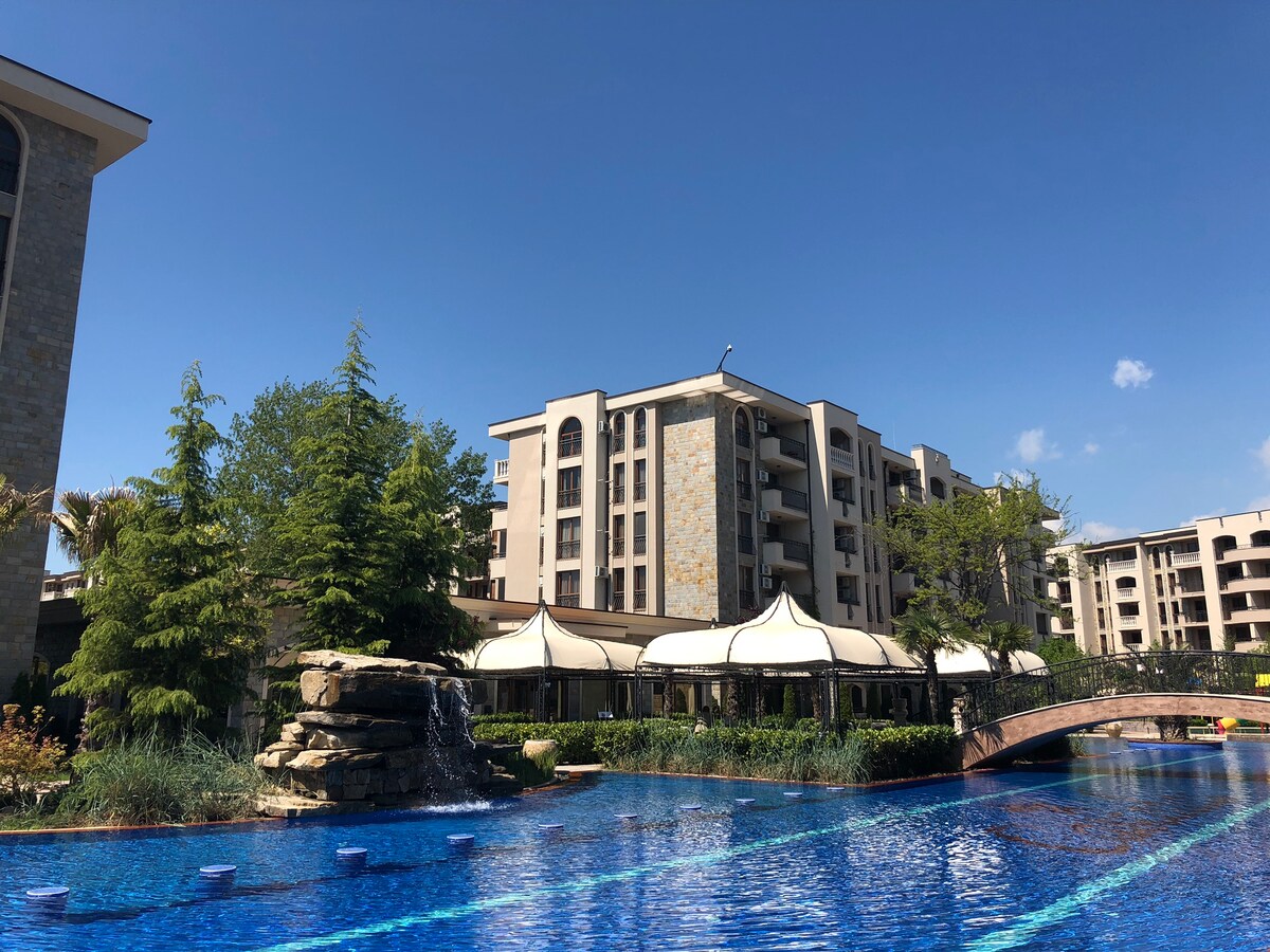 L'appartamento è sito in un elegante complesso a 4 stelle a Sunny Beach - Cascadas Family Resort. Enorme area verde, 10 piscine estive con lettini e ombrelloni gratuiti. Piscine per bambini con scivoli, animazione. Sport e parchi giochi splendidamente attrezzati, palestra e sauna. Zona sorvegliata chiusa con negozi e ristoranti. Il mare dista 700 m o 10 minuti a piedi.