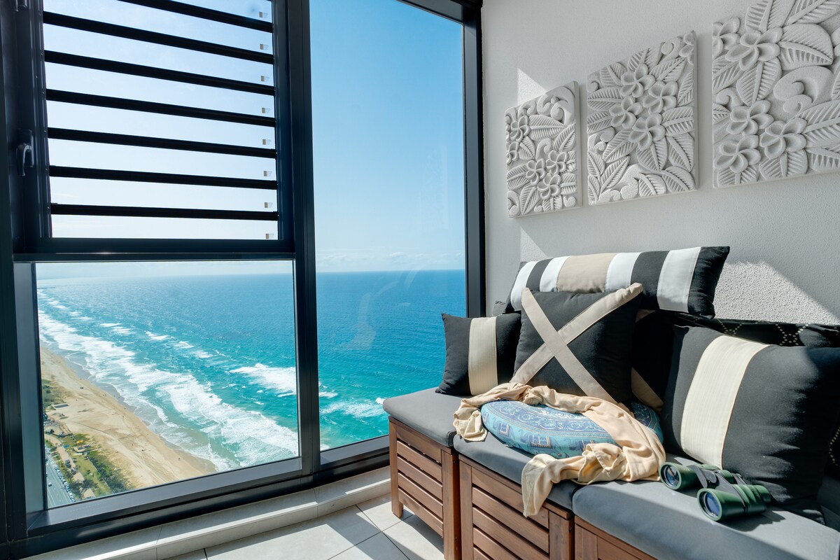 Goditi un soggiorno di lusso nel nostro splendido appartamento Circle On Cavil. Situato al 41° piano, offre una vista mozzafiato a 180 gradi sull'oceano e sull'entroterra. Situato in posizione centrale rispetto a tutti i negozi, alle spiagge e a Cavil Avenue. Rilassati e goditi le migliori viste dal tuo balcone privato. Cucina completa, vasca idromassaggio di lusso, il soggiorno è arredato con mobili King. Entrambe le camere da letto sono dotate di materassi di alta qualità. Raggiungi a piedi la spiaggia Non è necessaria l'auto: prendi un tram per Broadbeach o un autobus per tutti i parchi a tema.