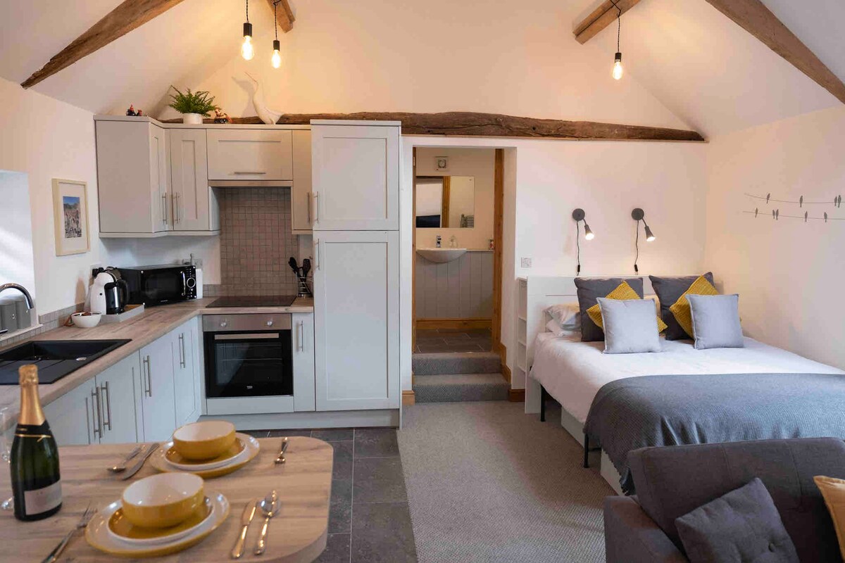 The Barrel house has been lovingly restored to provide a stylish, multifunctional space for Airbnb guests. The vaulted ceiling adds to the feeling of space. All windows are double glazed and a velux roof window allows the daylight to flood in. Outside there is a private patio area with a bistro set for outdoor dining or enjoying sundowners. Nearby is the village shop, popular butchers and local pub. There are plenty of walks to enjoy nearby.