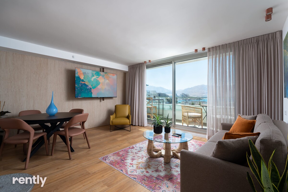 A fully renovated, spacious, beautiful apartment. located in a quiet and safe complex, just a few minutes' walk from the beach, restaurants and bars and few steps from a large supermarket. The apartment has bedroom, a living room, a dining area, fully equipped kitchen, The apartment has a balcony with stuning panoramic sea view which you can sit and enjoy eilat bay and the red mountains.