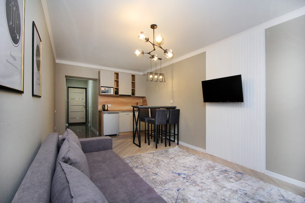 Goditi una vacanza elegante nel centro della città. Posizione vantaggiosa dell'appartamento con infrastrutture sviluppate. A pochi passi dal famoso Zelenyi Bazar, caffè, ristoranti, centri commerciali, farmacie, noleggio biciclette, metropolitana, stazione degli autobus e molto altro. Appartamento elegante, pulito e accogliente! Per i nostri ospiti c'è tutto il necessario per un soggiorno confortevole. Sul grande balcone aperto, si può gustare una tazza di caffè con una vista mozzafiato sulle montagne dall'8° piano. Nell'appartamento non si fuma.