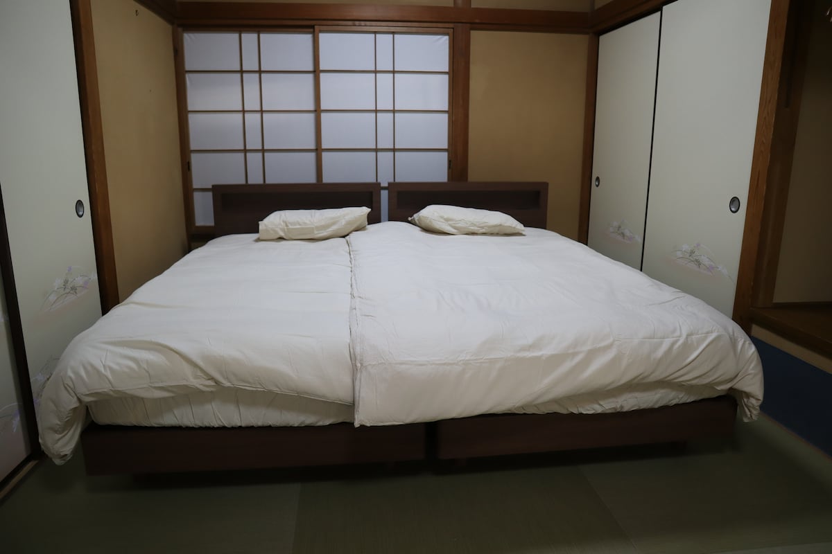 A modern Japanese-style guesthouse - large 110㎡, 4 bedrooms, 9 beds, 2 bathrooms, fits up 14 people - newly opened in 2025. Conveniently located just 3mins walk from Oshiage station @ Tokyo Skytree. Direct train access from Narita Airport and Haneda Airport. Close to popular tourist areas - walking distance or 2mins by train to Asakusa, direct trains to Shibuya and Shinjuku, 50mins by bus to Tokyo Disneyland, 45mins by train to TeamLab Planets and watch Sumo at nearby Ryogoku stadium.