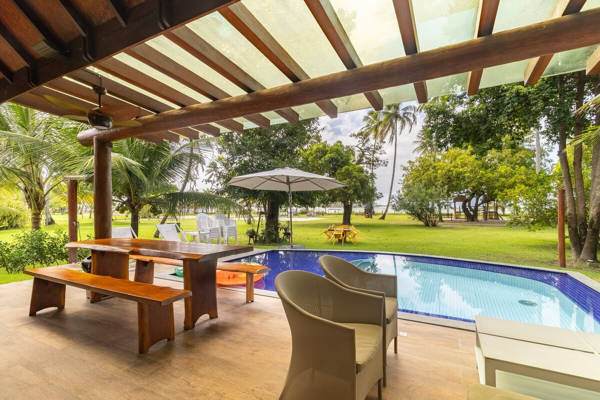 Goditi un soggiorno esclusivo all'Eco Resort Praia dos Carneiros! Il nostro bungalow fronte mare, uno dei pochi sulla sabbia, offre 3 suite climatizzate con lenzuola, 4 bagni, piscina privata, barbecue e area gourmet. È inclusa una governante per cucinare e riordinare. Cucina completamente attrezzata con utensili per barbecue, asciugacapelli, specchio per il trucco, lavatrice, TV, Wi-Fi, frigo per birra e zona pranzo interna/esterna. Svegliati con una vista spettacolare sull'oceano!