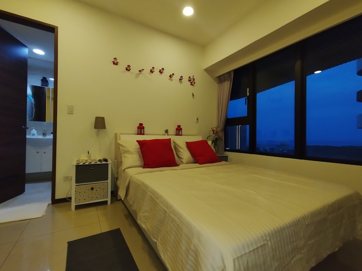 Nice place with night view of Guanyin Mountain and Tamsui River. 10 mins to Hongshulin MRT station. 5mins to Bus stop driving to Tamsui. We have a hot springs tub inside the bathroom. Quiet place and relaxed atmosphere. Public facility such as GYM, Spa and a small pool can be used. * We offer weekly and monthly discount.