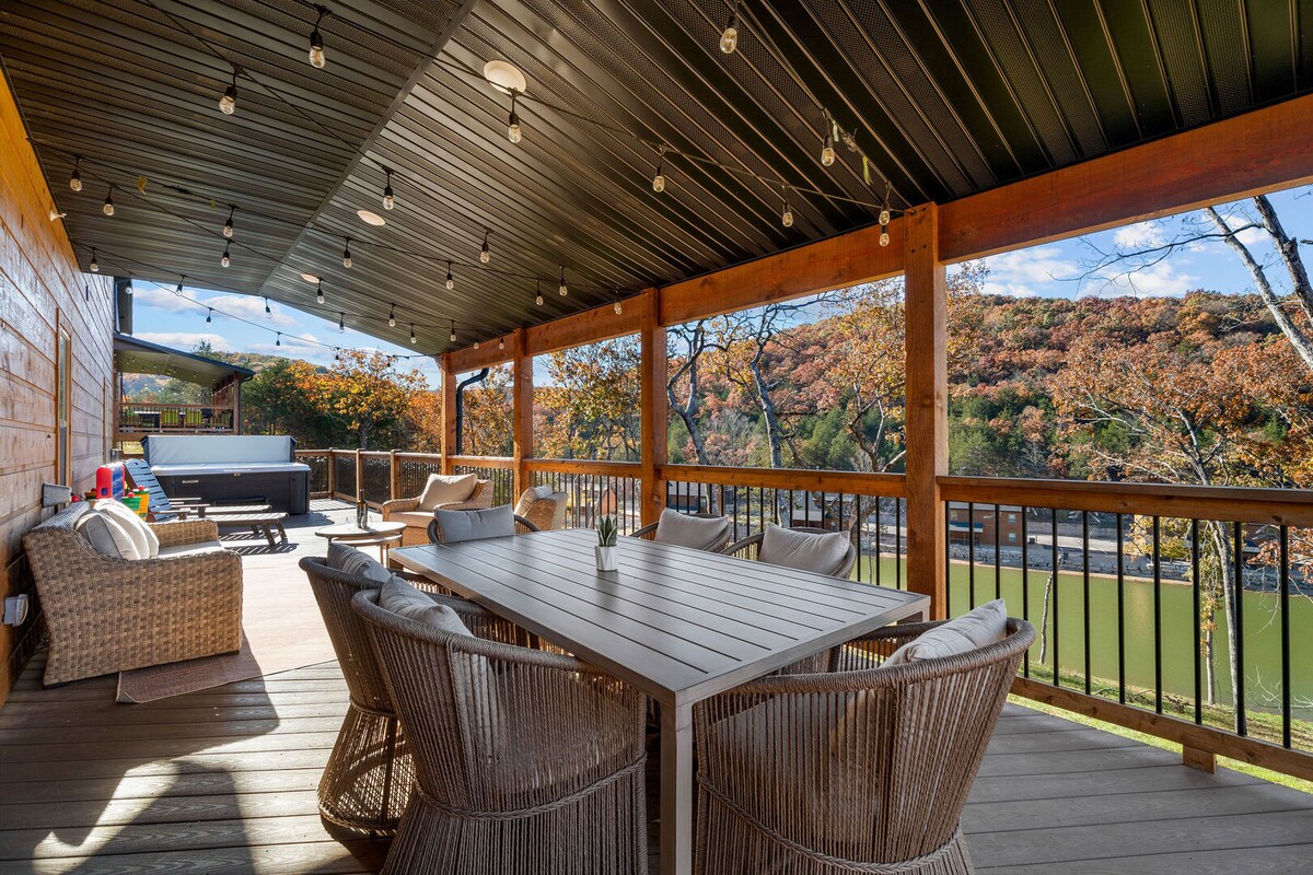 Imagine relaxing on your deck overlooking Lake Taneycomo and the Ozark Mountains in your PRIVATE HOT TUB, surrounded by nature. Your family will love watching the fish jump and the eagles soar across the water. Explore the lake in our kayaks or fish off the dock. Challenge the kids to a game of cornhole, and relax at the community pool. End your day around the lake-side fire pit, telling stories and making s'mores. This will be a Branson vacation everyone will remember!
