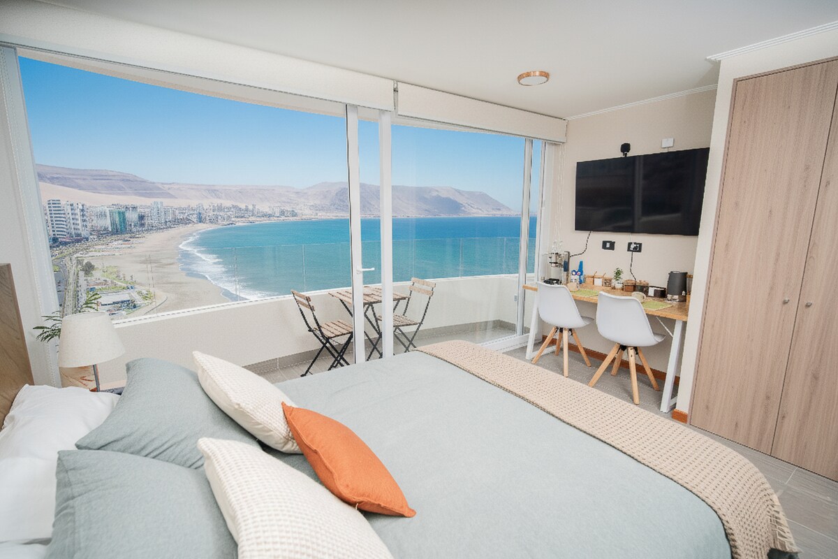 Goditi un soggiorno unico in questo monolocale completamente attrezzato situato sulla penisola di Iquique. Ha una vista mozzafiato su Playa Brava ed è anche a pochi passi da Playa Cavancha e dalle principali attrazioni turistiche della città. Questo accogliente spazio combina comfort, design e una vista spettacolare che ti permetterà di svegliarti guardando l'oceano. Parcheggio privato disponibile solo tra i mesi di dicembre 2025 e febbraio 2026.