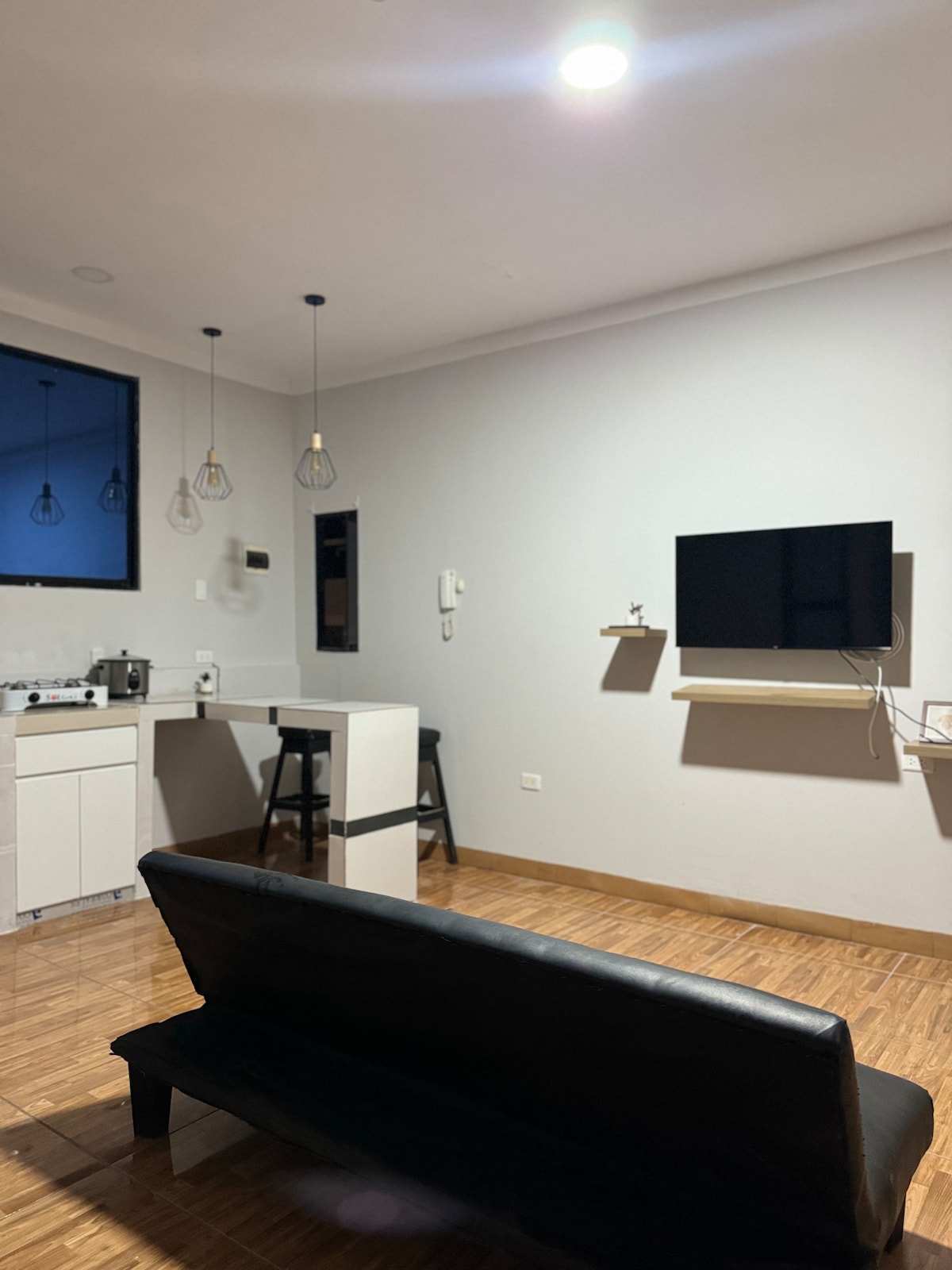 Suite con aire acondicionado a 7 cuadras de la plaza de Tarapoto, zona tranquila y segura, cerca a farmacias, consultorios médicos y odontológicos, mini-markets, mercado, fácil acceso. Está ubicado en el 3er piso Contamos con -Plancha de ropa -Intercomunicador con portero eléctrico. -Estacionamiento -Ventiladores adicionales -Netflix gratis -Extintores - Monoambiente - Kitchenette, baño completo propio, barra de estudio, ventilador de techo y de piso, y todo lo necesario para cocinar.